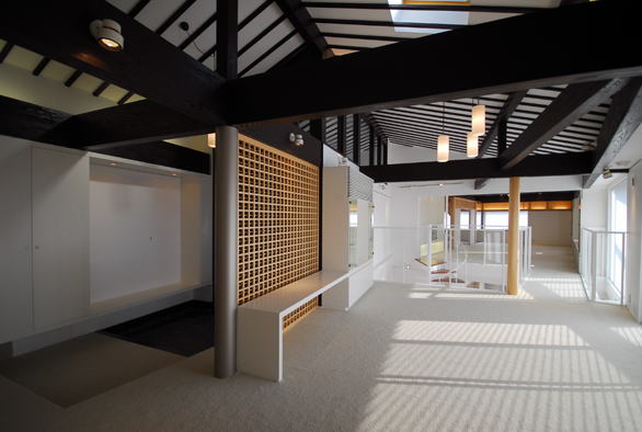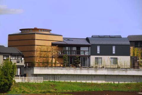右側は金属パネルとレンガの現代建築。その中間に木造の日本建築を挟み込んだ形態。