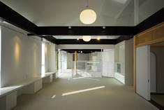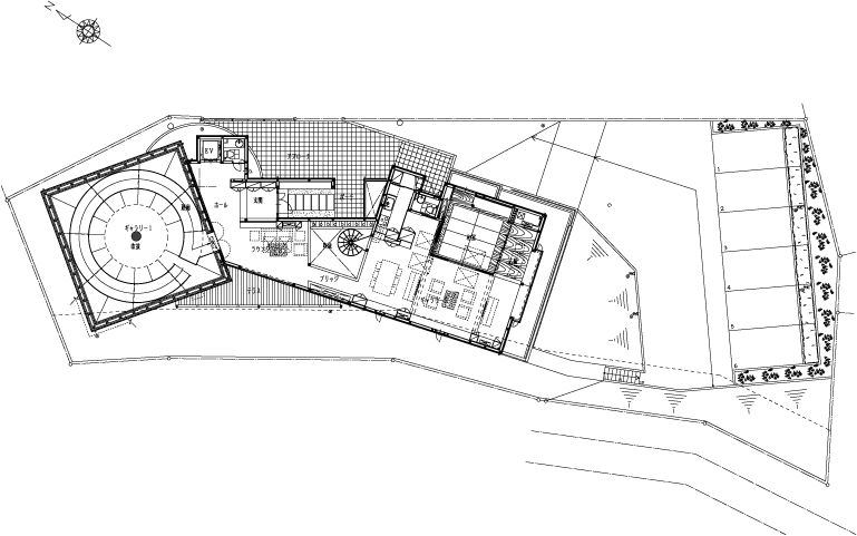 全体の配置図。建物は斜面に建つのでアクセス路からは平屋のように見える。左は9m角のギャラリー1、右の和室のある空間がギャラリー2.中央がエントランスホールとラウンジ
